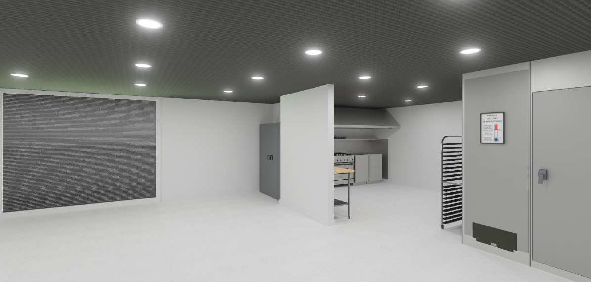- Large prep area with a 3-bay sink. "Option to add 2 additional 12-foot hoods or baking equipment".